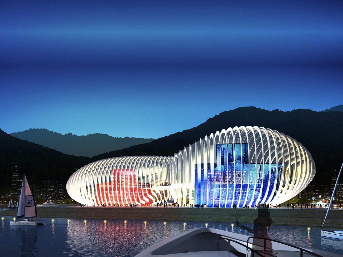 Abschließend ist die Konstruktion des Gebäudes wie eine Klangwelle konzipiert. Nachhaltig und umweltfreundlich spiegelt sie die neue Zukunft Koreas wider.