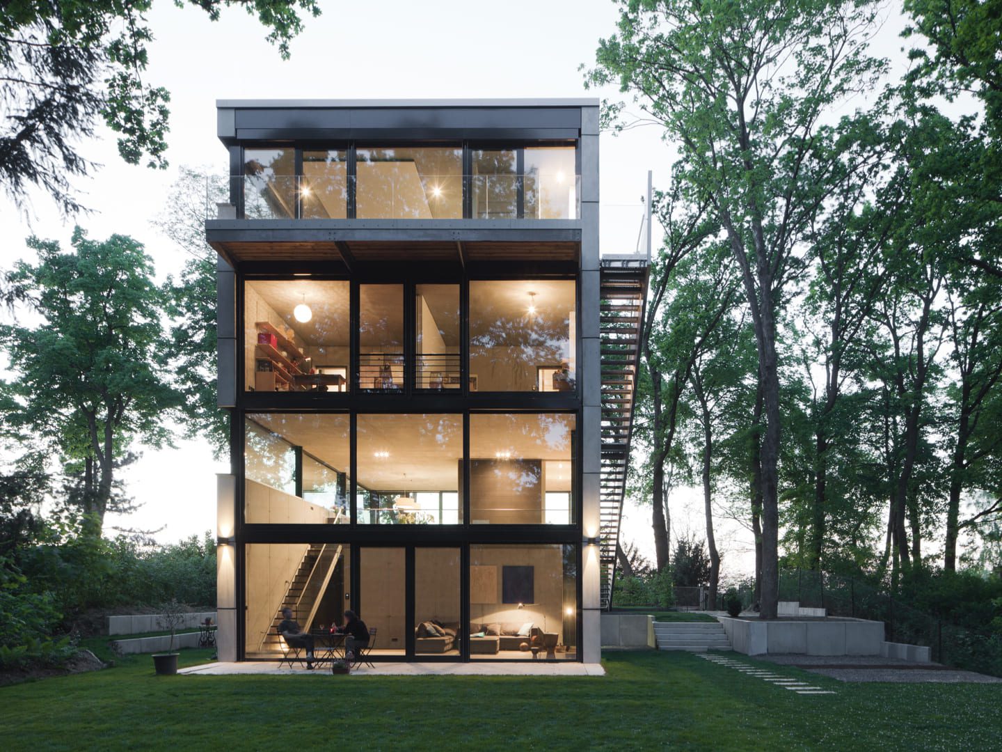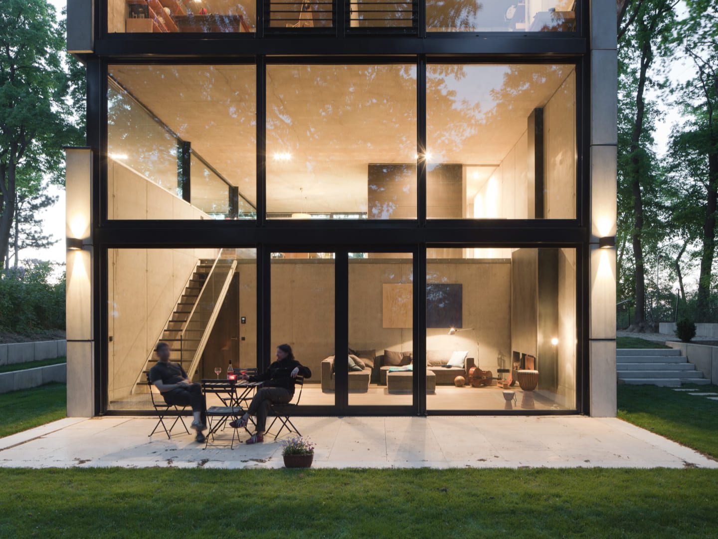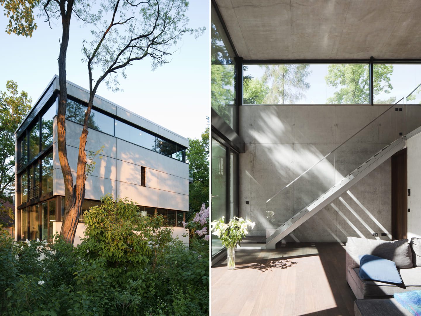 Die Konzeption der Fassaden spielt mit dem Gegensatz offen versus geschlossen, abhängig von der direkten Umgebung und den sich ergebenen Ausblicken. Die Schmalseiten sind großflächig verglast, nach Süden in den Garten und nach Norden mit Blick über den See. Die West- und Ostfassade zu den Nachbargrundstücken ist eher geschlossen und wird mit großflächigen Betonfertigteilen und einigen schmalen Glasbändern gestaltet.