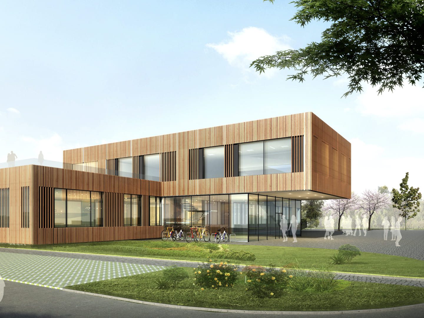 Darüber hinaus wurde das Gebäude als Niedrigstenergiegebäude konzipiert. Die charakteristische Fassade aus nachhaltig gewonnenem Lärchenholz sorgt für effektive Verschattung und schützt gleichzeitig die hochwärmegedämmte Gebäudehülle. Im Inneren reduziert eine ausgeklügelte Verschaltung der drei Flächenbereiche – Werkstätten, Labor- und Büroflächen – unnötige Laufwege und den Flächenverbrauch durch die technische Gebäudeausrüstung (TGA). Dies ermöglicht maximale Flexibilität bei gleichzeitig effizienter Raumnutzung. Gemeinschaftsflächen wie ein Multifunktionsraum im Erdgeschoss, ein Besprechungsraum im Obergeschoss sowie eine großzügig gestaltete Dachterrasse stehen allen Mietern offen.