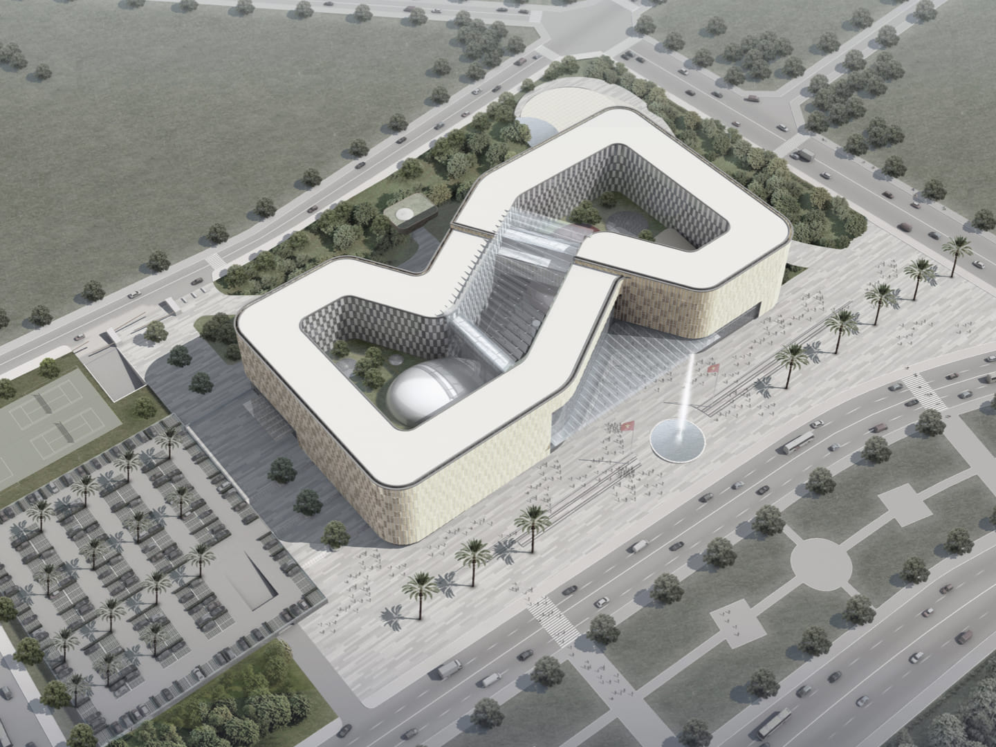 Zunächst liegt der architektonische Entwurf für das Außenministerium Vietnam eingebettet in eine weitläufige Parklandschaft, welche eine harmonische Verbindung von Natur, Kultur und städtischem Raum schafft. Der gesamte Komplex greift bewusst traditionelle Elemente sowie kulturelle Symbole der vietnamesischen Hauptstadt Hanoi auf und transformiert diese zu einer kraftvollen architektonischen Großform.