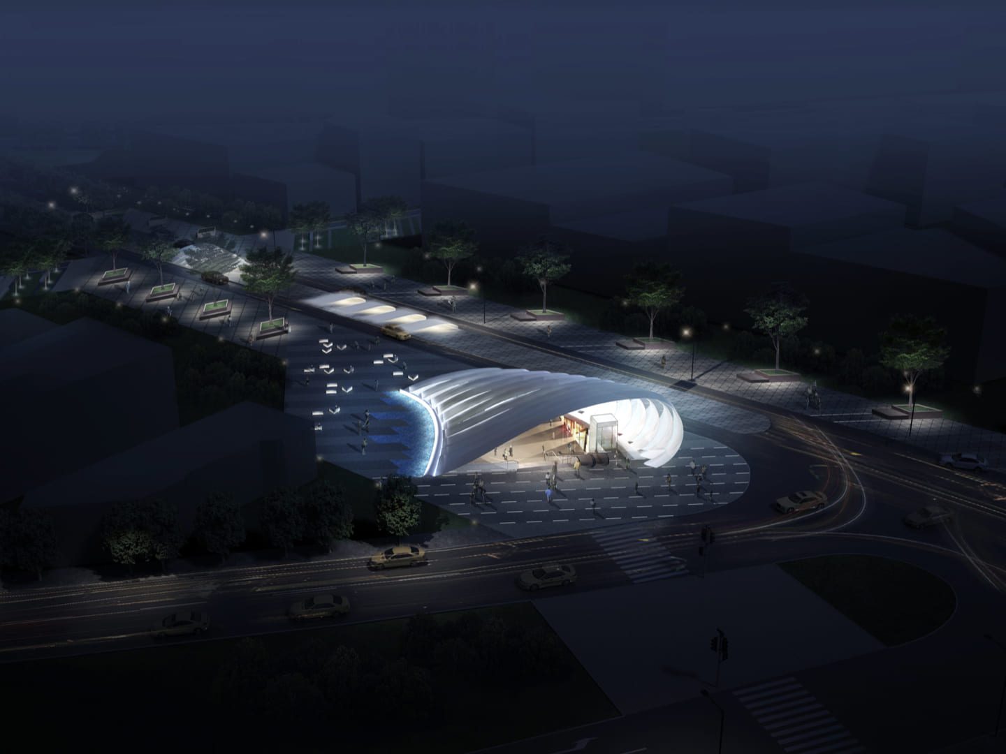 Des Weiteren erfolgt der Hauptzugang zum Concourse Level der U-Bahn Station Sofia über einen großzügigen Vorplatz. Dieser Vorplatz orientiert sich an der Hauptkreuzung. Gleichzeitig bietet er ausreichend Raum zwischen dem U-Bahn-Eingang und den Bushaltestellen. Die freigeformte Überdachung entwickelt sich wie eine Welle aus der Landschaft. Dadurch wird der Vorplatz als öffentlicher Raum deutlich erkennbar. Die Konstruktion besteht aus einer leichten, freitragenden Stahlstruktur mit weißen Membranen. So entsteht eine elegante Skulptur, die die beleuchtete Unterwelt der Station reflektiert und nach außen transportiert.